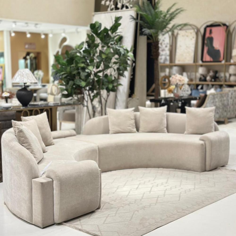 تصميم نصف دائري ناعم الخطوط يخلق إحساسًا بالدفء والترابط داخل الجلسة، مثالي للمجالس الفاخرة أو الصالات الواسعة ذات الطابع الحديث.