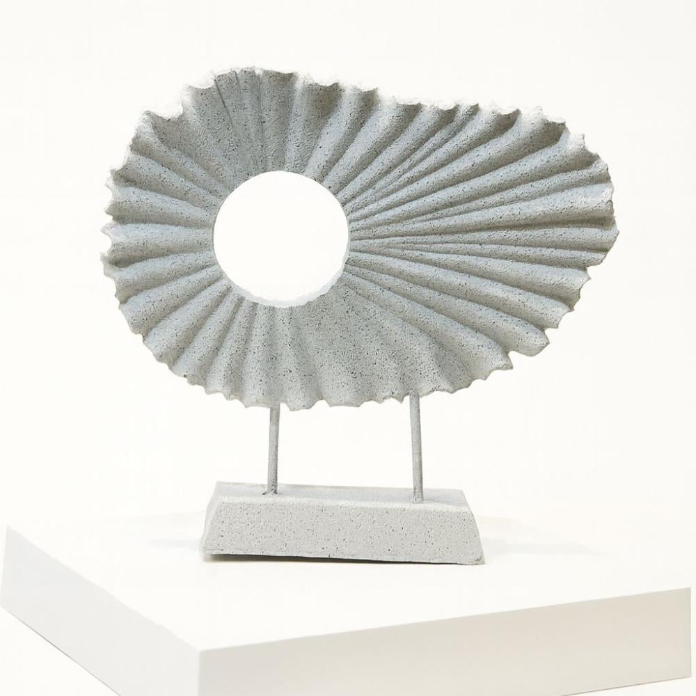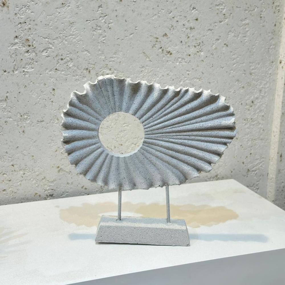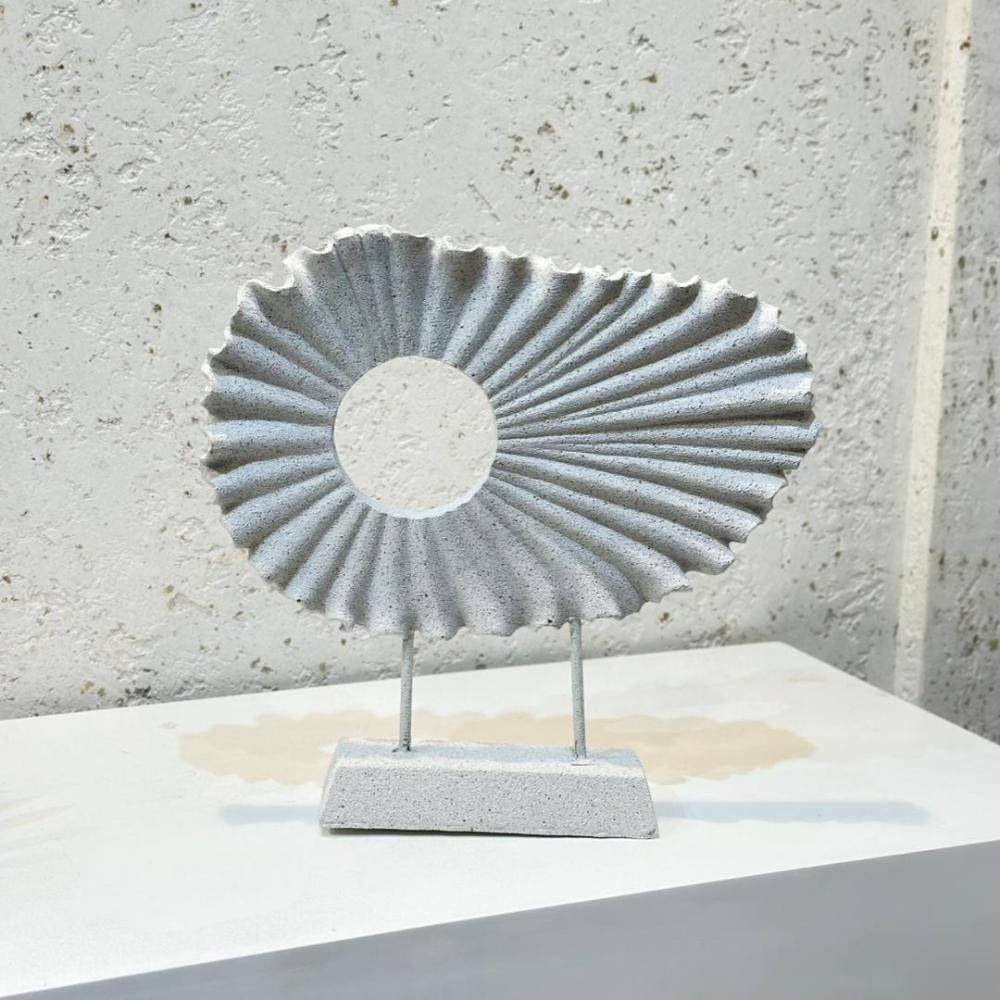 ٨٨تحفة ديكورية عصرية بتصميم هندسي مميز من الحجر الصناعي باللون الرمادي الفاتح، تتميز بفتحة دائرية في المنتصف وانحناءات شعاعية تضفي عليها طابعًا فنّيًا راقيًا. قطعة مثالية لتزيين طاولات الصالون أو المكاتب، تضيف لمسة من الأناقة والحداثة إلى أي مساحة داخلية