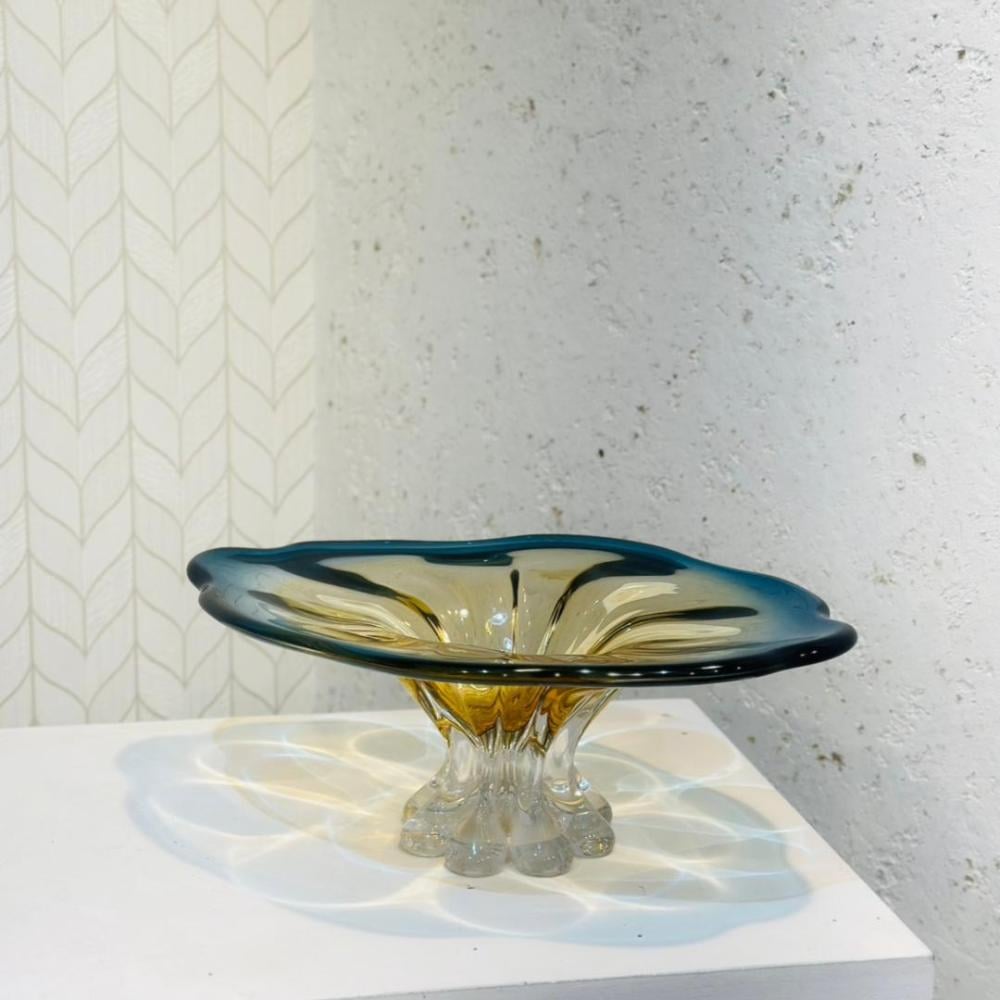 وعاء زجاجي أنيق مصنوع بتقنية النفخ اليدوي، يتميز بتصميم متموج يشبه تفتح الزهرة. يأتي بلون كهرماني ذهبي متدرج يضفي دفئًا وحيوية، مع لمعان يعكس الضوء بشكل ساحر على سطحه وعلى القاعدة البيضاء. القطعة تعكس الحرفية والفن في أدق تفاصيلها، لتكون إضافة مثالية كديكور فاخر في الطاولات أو المجالس.