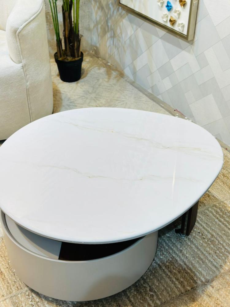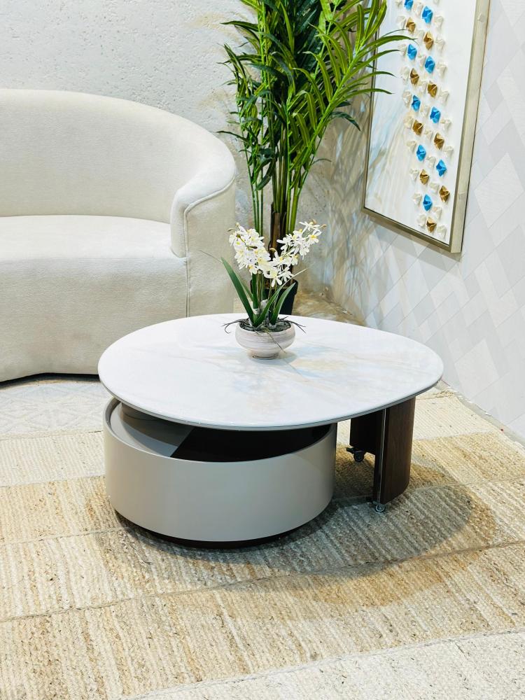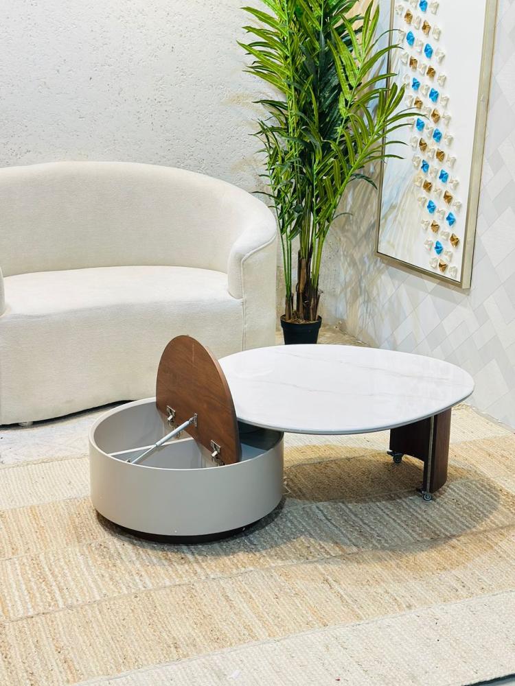 ١٬٣٠٠طاولة قهوة دائرية بتصميم عصري أنيق، تجمع بين السطح الرخامي الفاخر باللون الأبيض ذي العروق الهادئة وقاعدة متينة تجمع بين الخشب والمعدن باللون الداكن. تتميز بآلية عملية تسمح بفتحها جزئياً مع وجود طاولة جانبية أصغر متداخلة، بقاعدة دائرية رمادية وقطعة علوية خشبية أنيقة، مما يمنحها مظهراً فاخراً ووظيفة عملية للتخزين والاستخدام اليومي.