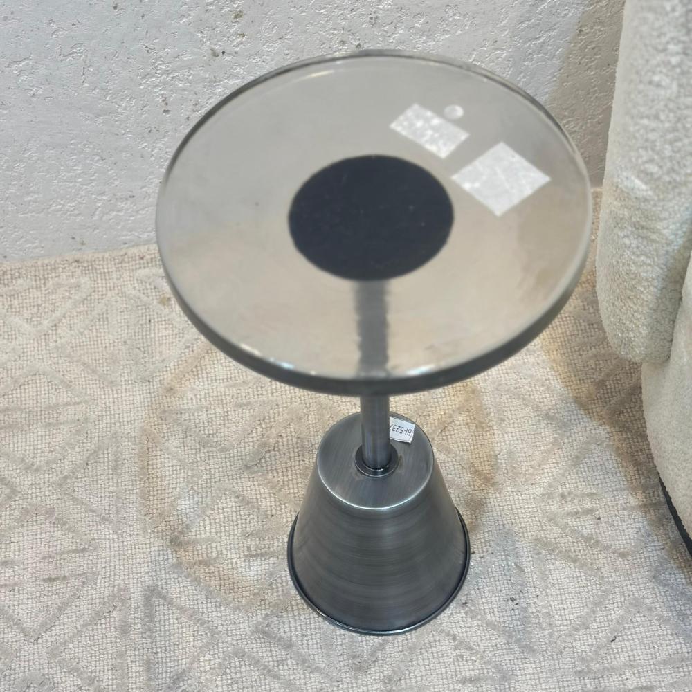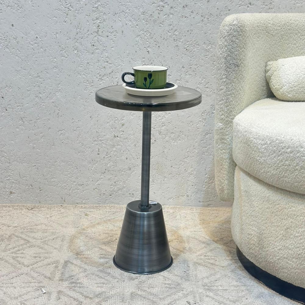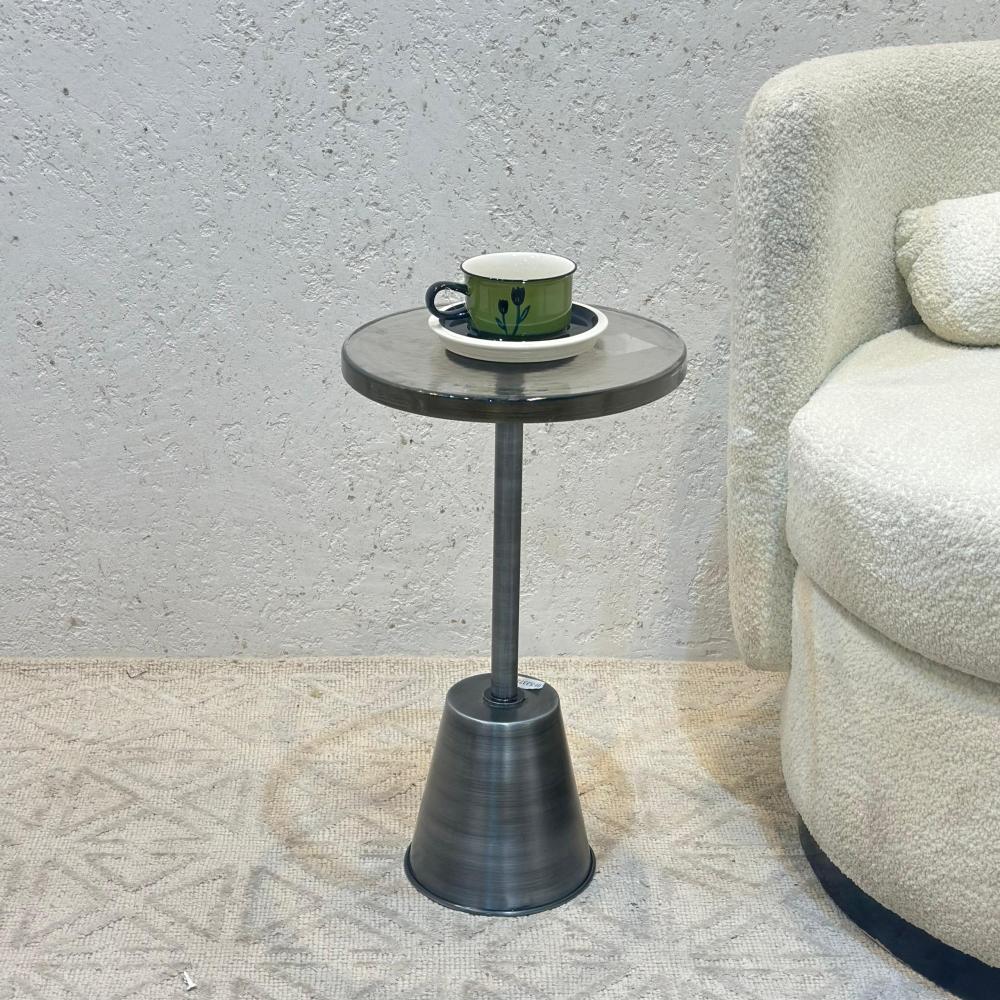 تتميز الطاولة بسطح دائري أنيق بلون معدني رمادي بلمعة خفيفة تضيف عمقاً بصرياً فاخراً، مدعوم بقاعدة مخروطية صلبة تمنحها استقرارًا مثاليًا. يتوسطها عمود معدني نحيف يعزز من انسيابية التصميم ويمنحها طابعًا متوازنًا بين البساطة والحداثة.