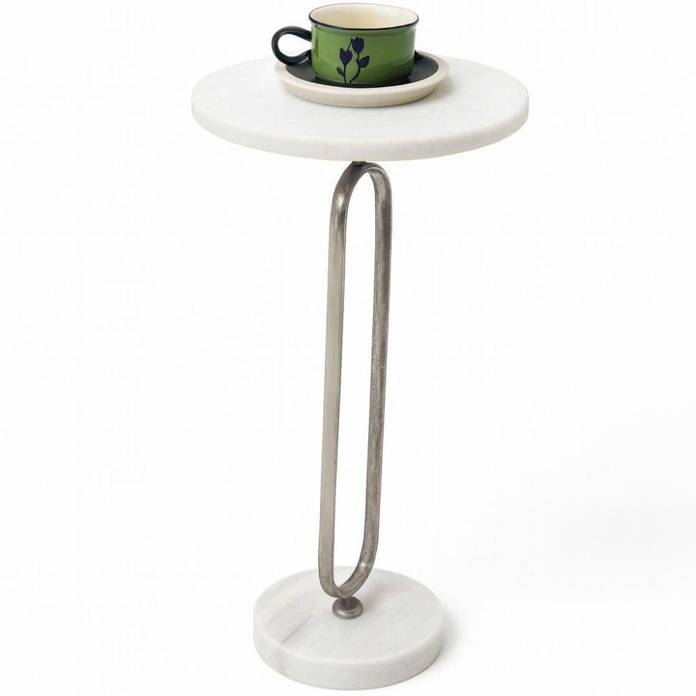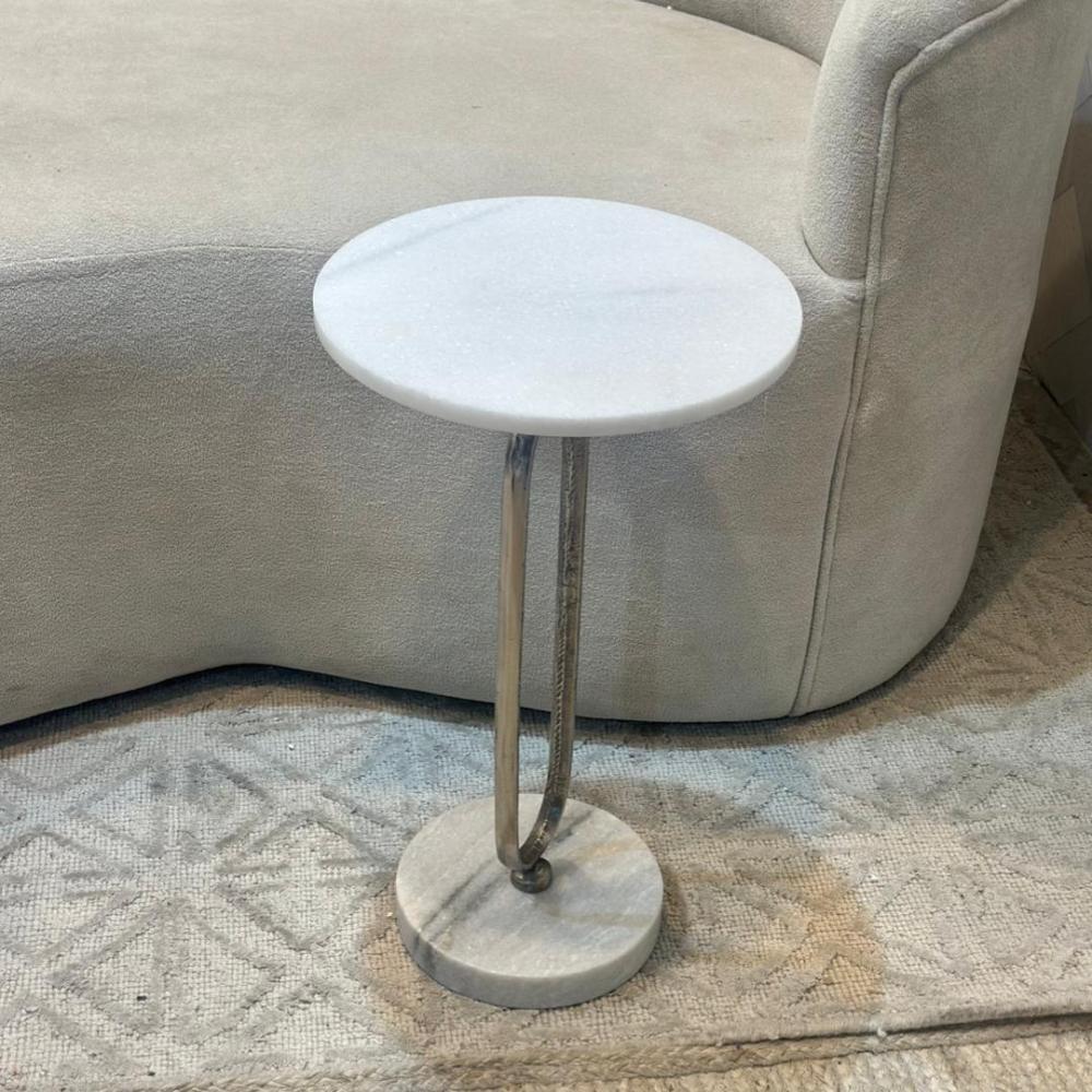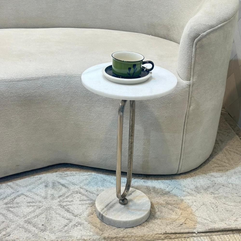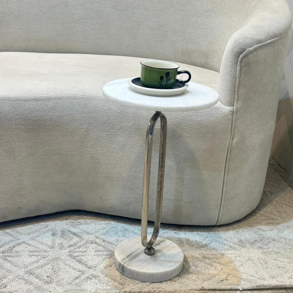 يأتي السطح العلوي من الرخام الأبيض الطبيعي بملمس ناعم ولمعان خفيف يعكس الفخامة، بينما ترتكز الطاولة على قاعدة معدنية بتصميم منحني أنيق يمنحها ثباتًا وأناقة في الوقت ذاته.