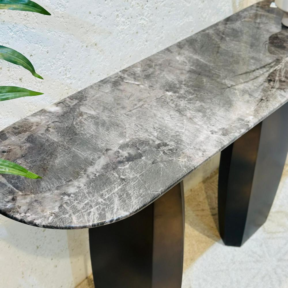 سطح الطاولة من رخام رمادي فاخر مع عروق طبيعية تضفي لمسة راقية، فيما تأتي القاعدة على شكل أرجل معدنية سوداء بتصميم منحني يعكس الثبات والتميز.
