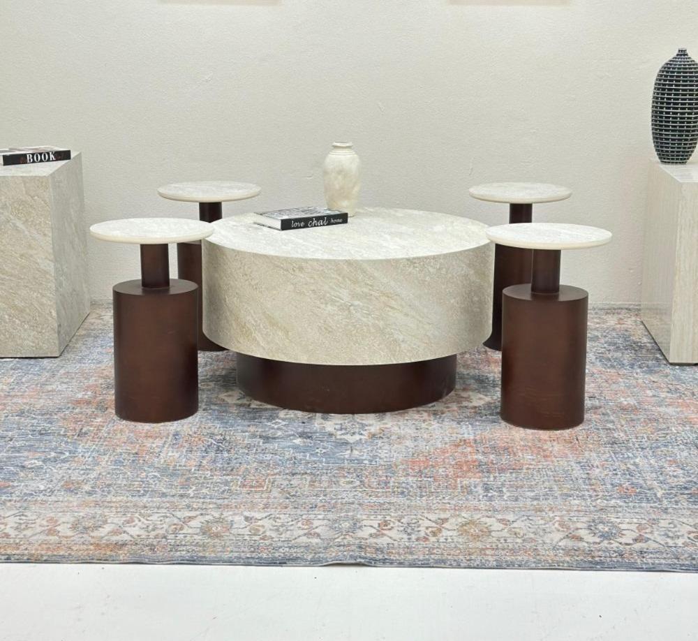 طقم طاولات اسطواني 5قطع سطح بديل الحجر قاعدة خشب لون بني