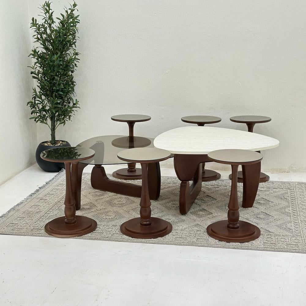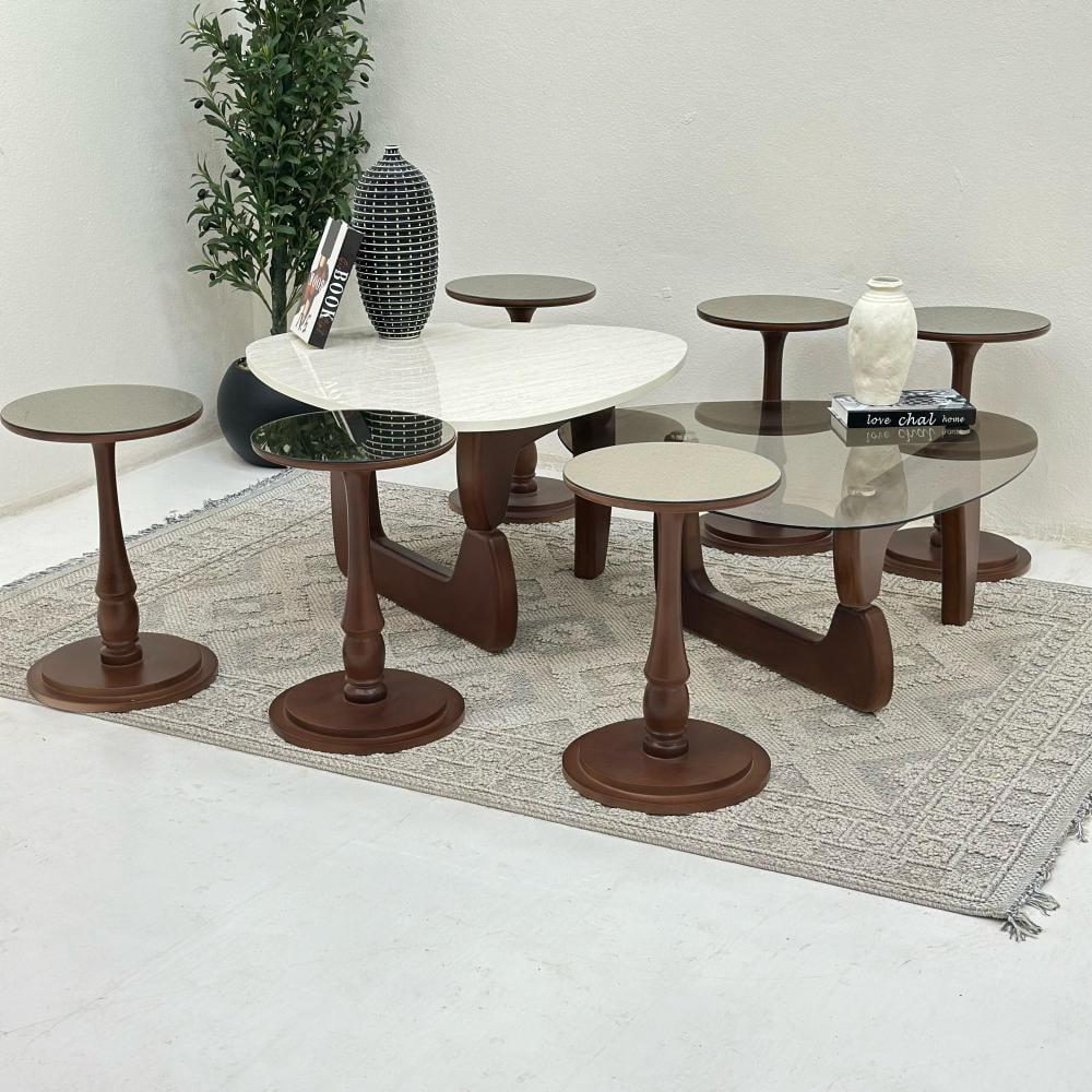 طقم طاولات 8قطع سطح الطاولة الاولى: بديل الرخام ترافنتينو ملمس ناعم ،والثانيه سطح زجاج قاعداتهما خشب لون بني