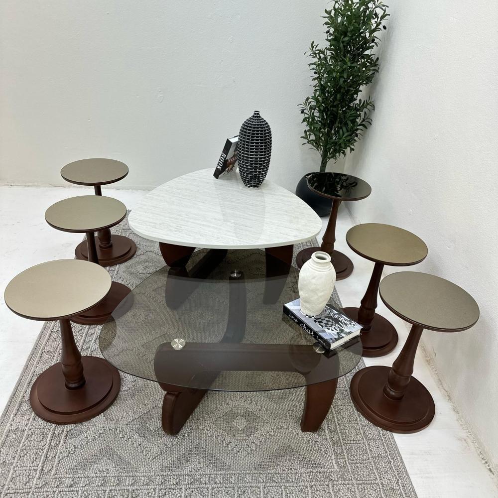 ٢٬٠٢٤طقم طاولة القهوة الفاخر هذه . يتضمن طاولتين وسط و6 طاولات جانبية، الطاولة الاولى: مصنوعه من بديل الرخام وخشب عالي الجوده الشكل مثلث. والطاولة الثانية: مصنوعه من الزجاج والخشب عالي الجودة الشكل مثلث . وال6 الطاولات الجانبيه سطح بديل الرخام قاعده خشب، يضيف الشكل المثلث للطاولات لمسة من الأناقة إلى أي مساحة، بينما يضمن البناء الخشبي الصلب القوي المتانة وطول العمر.