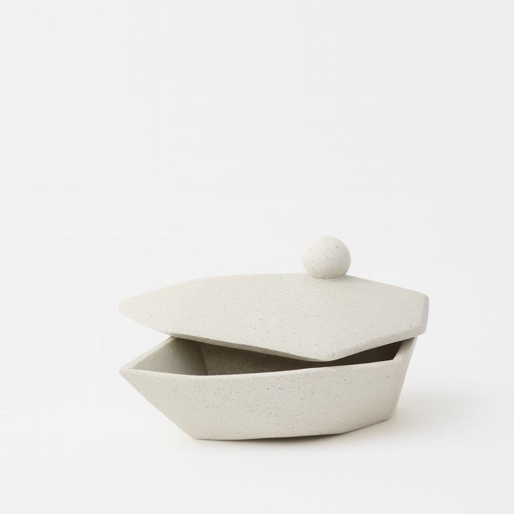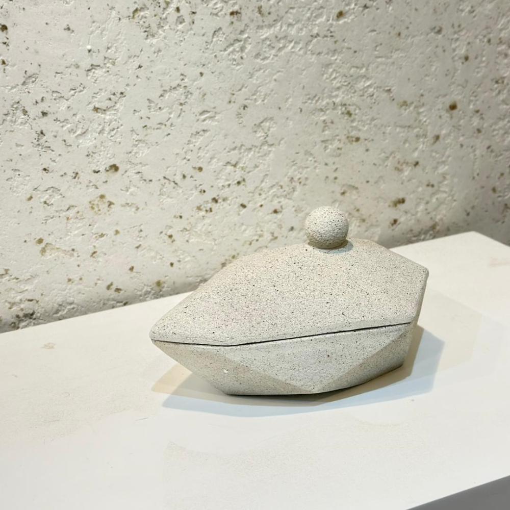 ٦٦علبة ديكورية بغطاء مصنوعة من خامة حجرية فاخرة بلون رمادي فاتح مرقّط، بتصميم هندسي عصري غير تقليدي. الغطاء يأتي بشكل مائل مع مقبض دائري أنيق يضيف لمسة فنية مميزة.