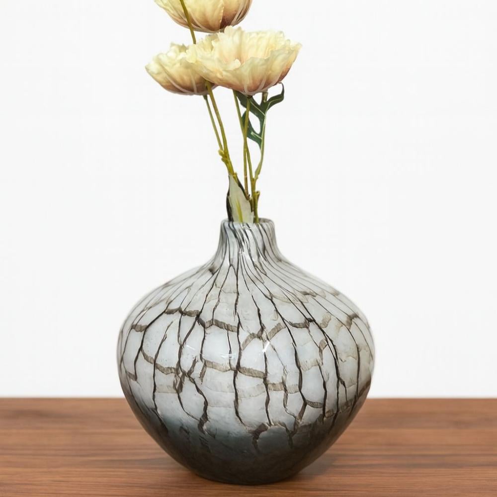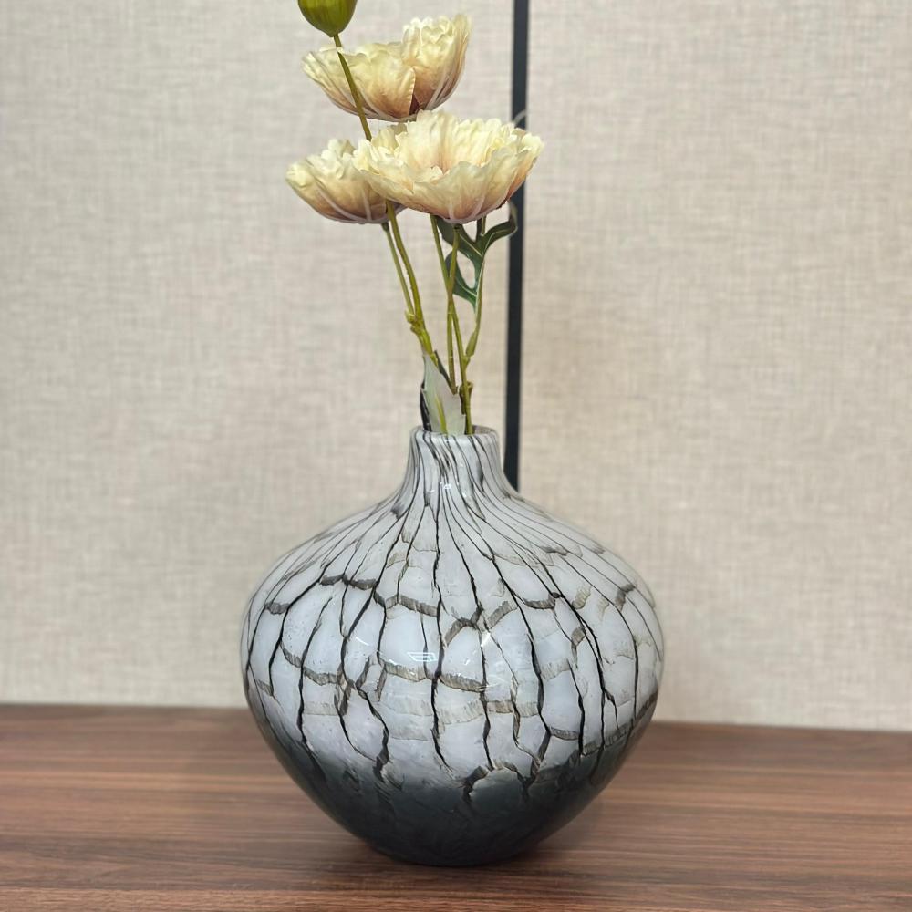 مزهرية فاخرة بتصميم فني مميز، مصنوعة من الزجاج عالي الجودة بتدرجات ألوان متداخلة بأسلوب عشوائي أنيق يمنحها طابعاً فنياً فريداً. شكلها الانسيابي العمودي يجعلها مثالية لتزيين الطاولات أو زوايا المجالس، سواء مع الورود الطبيعية أو كقطعة ديكور قائمة بذاتها. قطعة تضيف لمسة من الفخامة والجرأة العصرية لأي مساحة داخلية