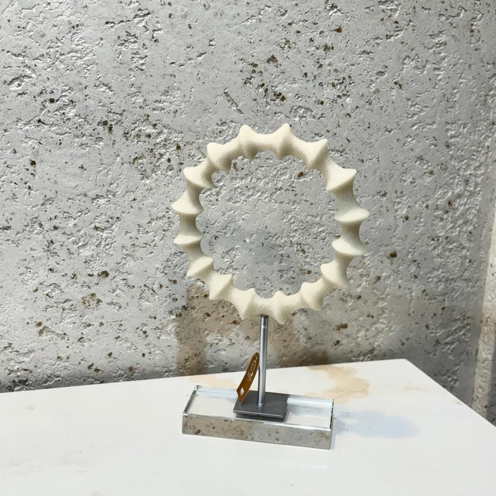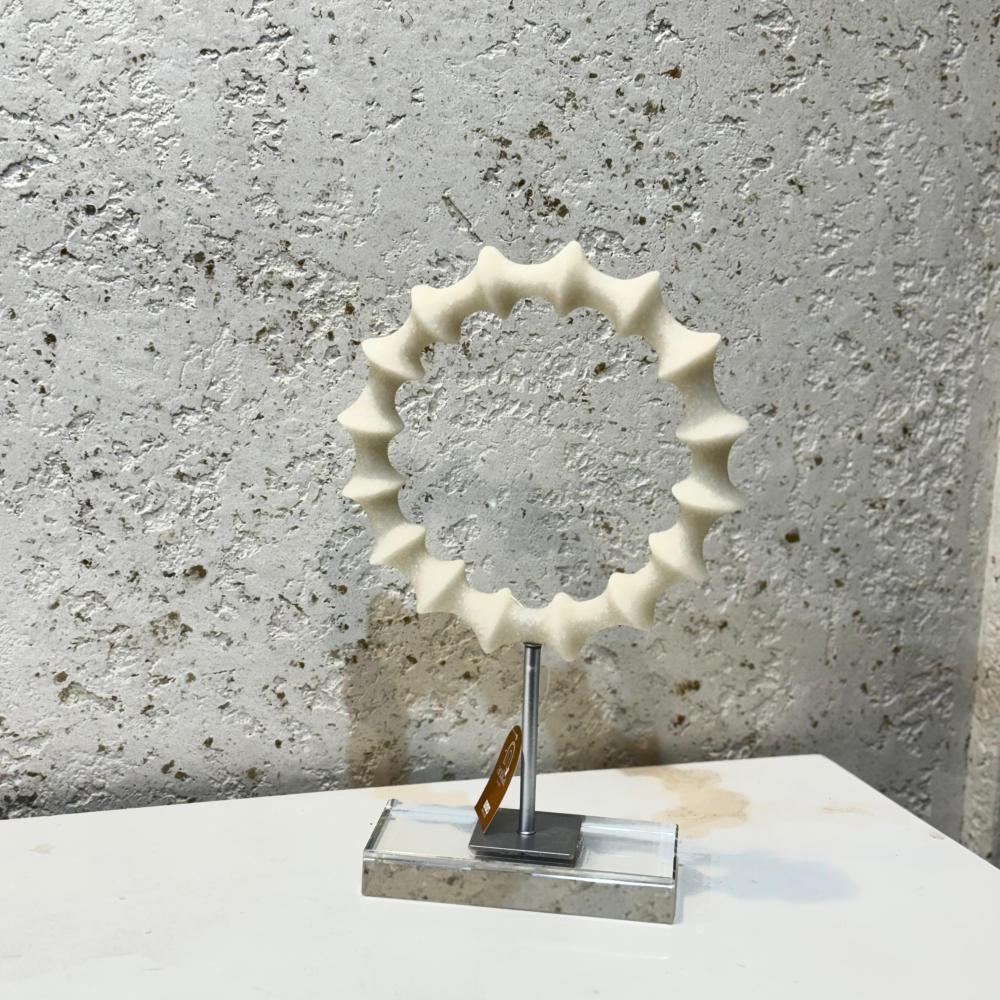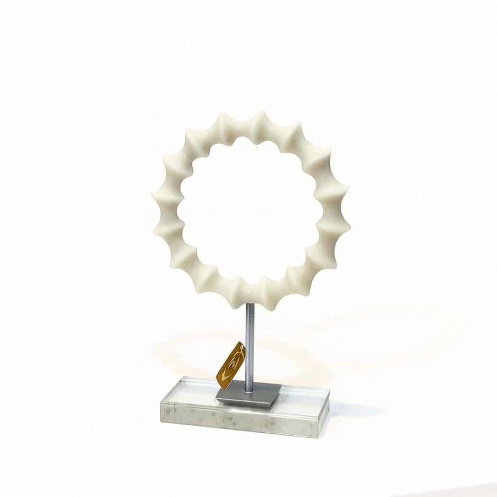 قطعة ديكور فنية بتصميم دائري مميز يشبه الشمس أو التروس، باللون البيج الفاتح مع بروزات هندسية متناسقة تمنحها مظهراً عصرياً مبتكراً. مثبتة على حامل معدني وقاعدة شفافة أنيقة تضيف لمسة من الفخامة. مثالية لتزيين الطاولات أو الأرفف وإبراز جمال المجالس والمكاتب بلمسة حديثة وفريدة