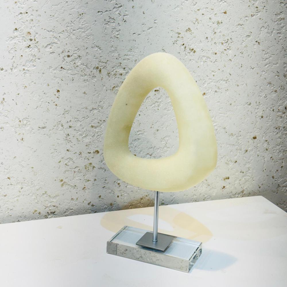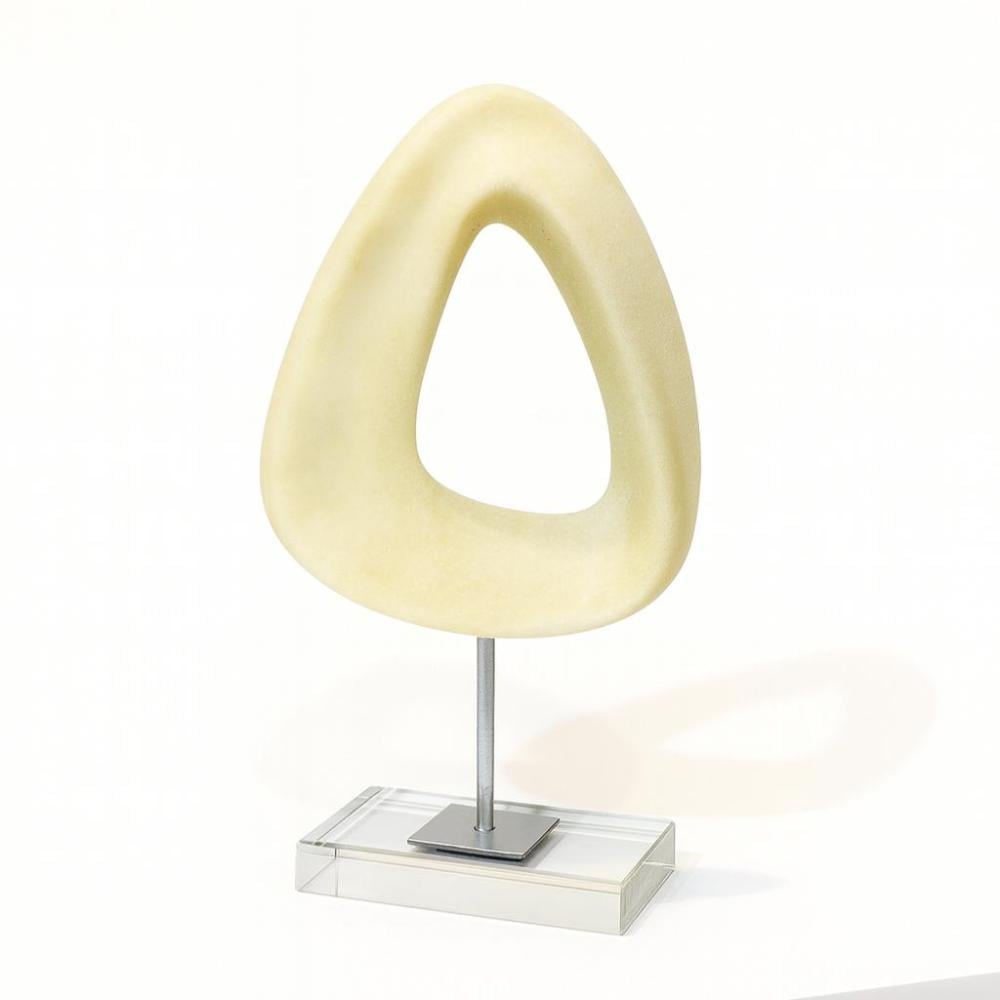 قطعة ديكور فنية بتصميم مجرد وعصري، تأخذ شكل مثلث دائري بحواف ناعمة بلون بيج فاتح أنيق. ترتكز على قاعدة شفافة مع حامل معدني رفيع يمنحها ثباتاً وأناقة إضافية. تتميز ببساطتها وجاذبيتها كعنصر ديكوري مستقل يضفي لمسة من الحداثة والذوق الرفيع على الطاولات أو الأرفف في المجالس والمكاتب