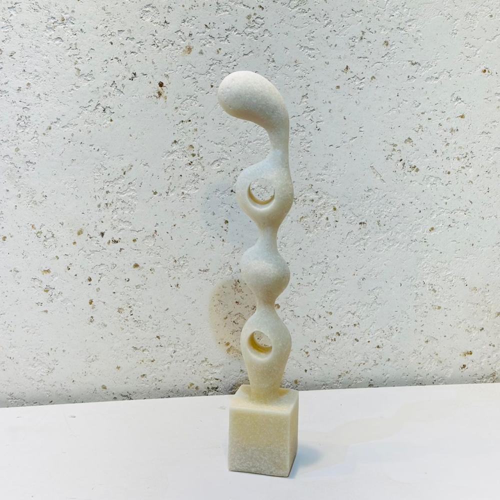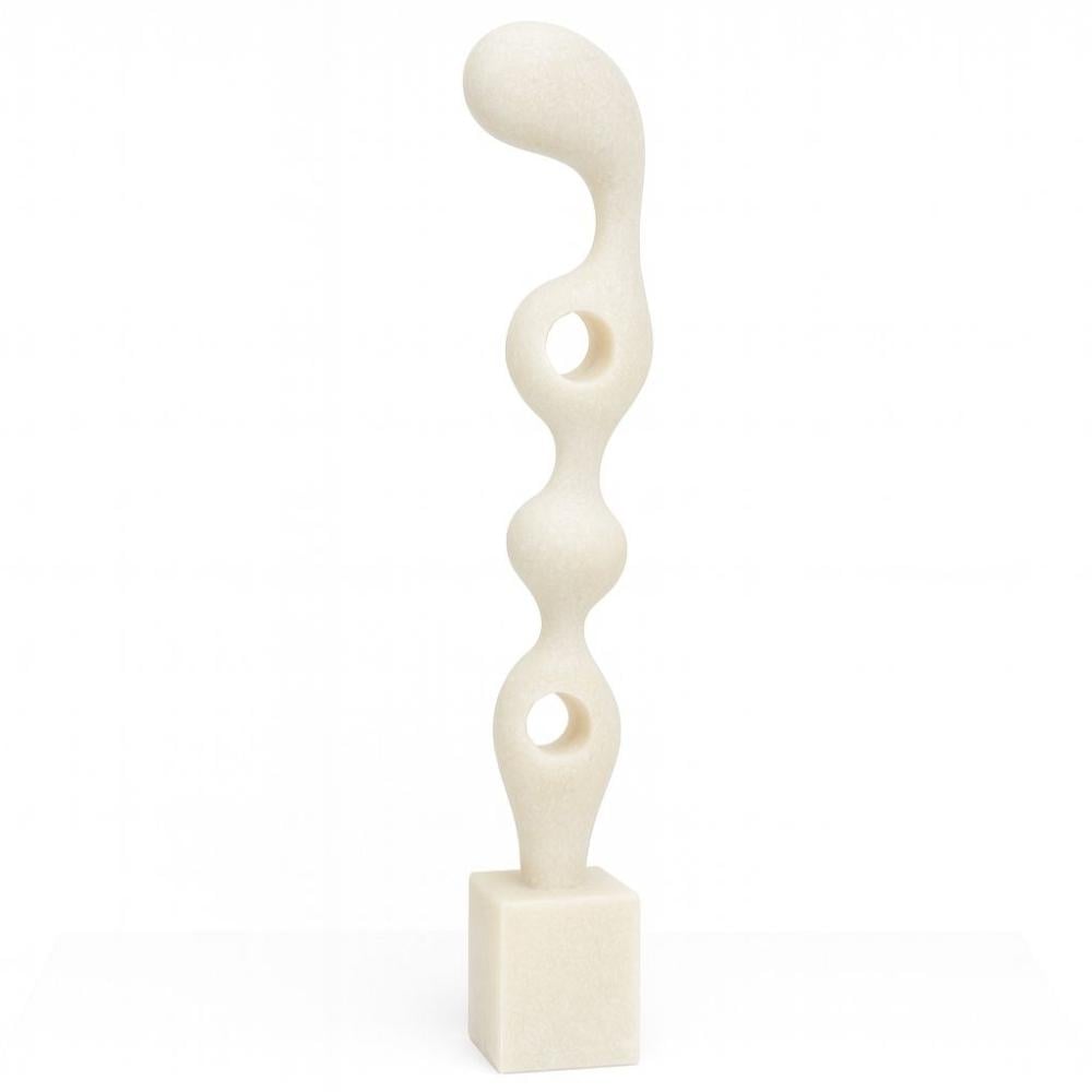 المجسّم المعروض عبارة عن قطعة ديكورية فنية مصممة بأسلوب تجريدي معاصر. مصنوع من خامة تشبه الرخام بلون عاجي فاتح، ويقوم على قاعدة مكعبة صلبة تمنحه ثباتًا. يمتد المجسّم بشكل طولي متدرج بأشكال عضوية منحنية وانسيابية تتخللها فتحات دائرية تضفي لمسة فنية مبتكرة.