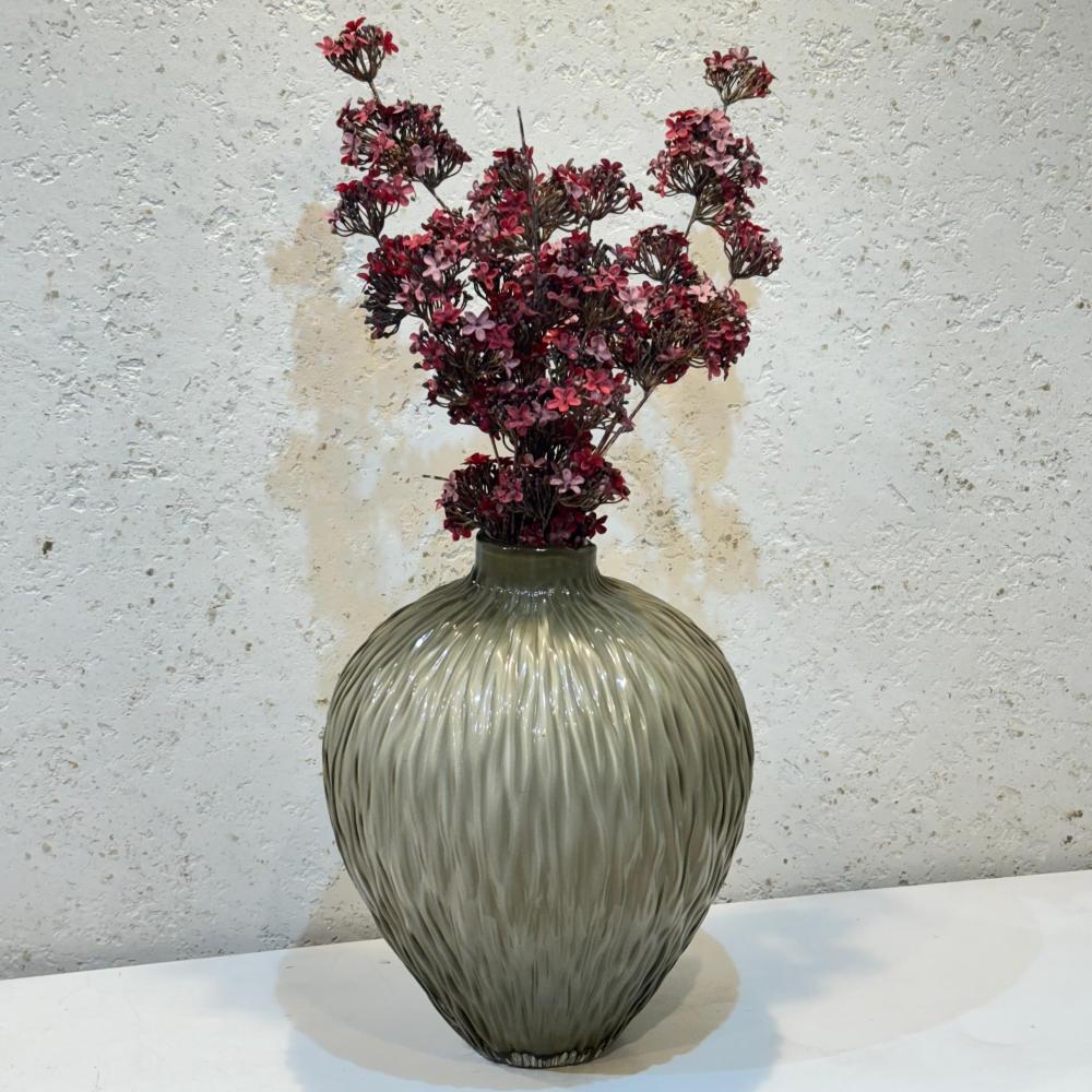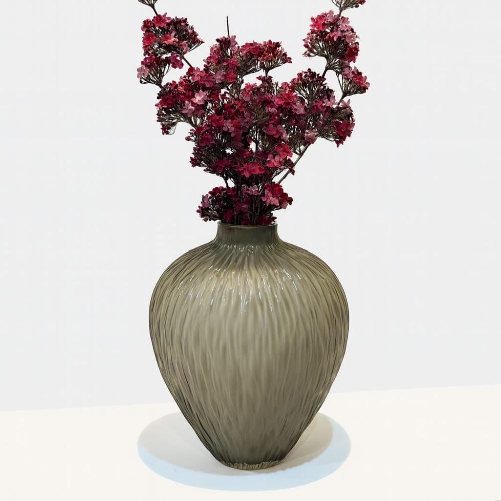 ٢٤٠مزهرية زجاجية فاخرة بتصميم أنيق وعصري، تتميز بلونها الذهبي المائل إلى البني مع لمعة شفافة تضفي عليها جاذبية خاصة. يزين سطحها نقش متموج يشبه الخطوط الطولية الناعمة، مما يضيف لمسة فنية وحساً بالحركة والانسيابية.